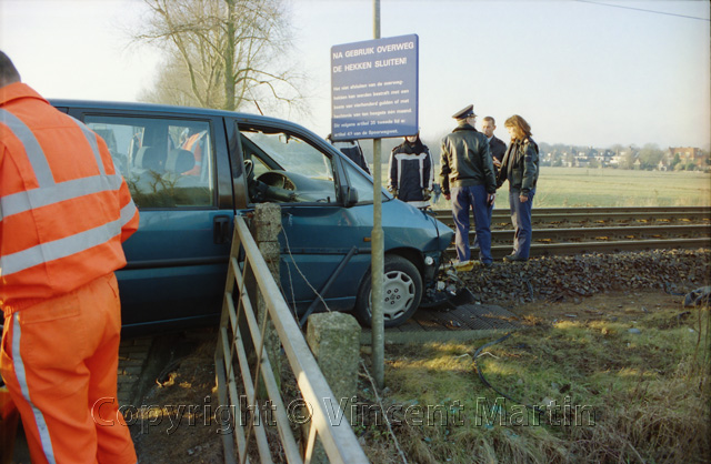 Aanrijding tussen een personenauto en een trein op de Leidsevaartweg op de onbewaakte overweg naar de Boekenroodeweg |