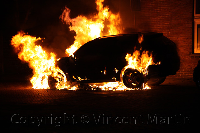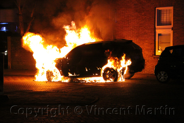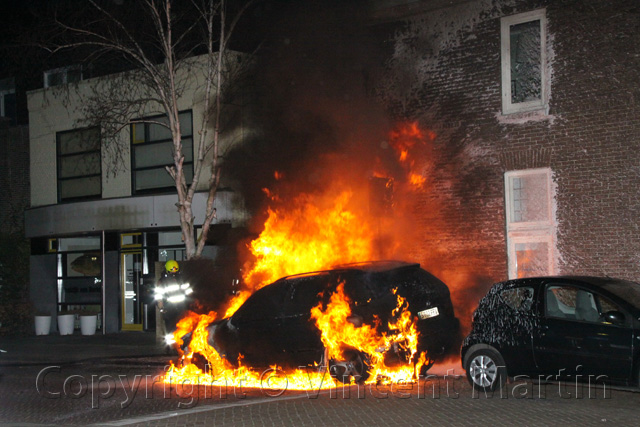 Autobrand in de Postlaan, door snel optreden van de brandweer is overslag naar de woning voorkomen. |