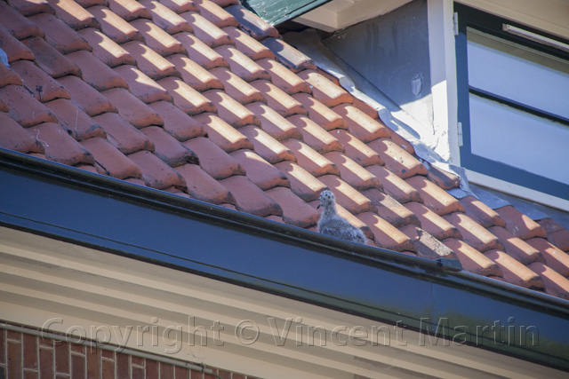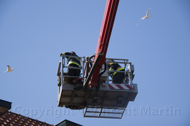 De hoogwerker uit Hoofddorp kwam zondagmiddag in actie voor een jonge meeuw die uit het nest was gevallen en in de dakgoot terecht was gekomen van een woning aan de Landzichtlaan, de volwassen meeuwen beschermen hun kroost en maakten het de hulpverleners moeilijk. |